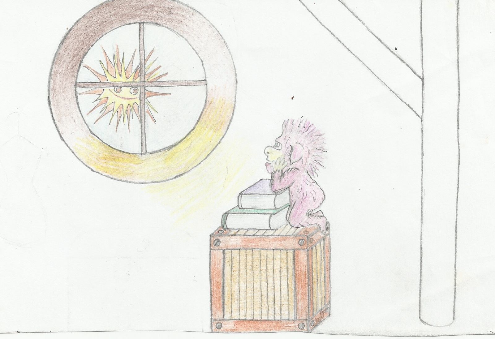 В доме Бабая в это время царила тишина. За окном было утро, а с восходом солнца все семейство обычно отправлялось в свои кровати. И только одна Кока не хотела спать, ведь на чердаке ее уже ждал друг, Солнечный зайчик. Кока осторожно вышла из своей комнаты и на цыпочках, чтобы никого не разбудить, быстренько стал подниматься по лестнице к чердаку. Так как Кока была еще маленькой, лестница была для нее очень большой. На каждую ступеньку она взбиралась как альпинист. Но эту преграду она ловко преодолела и вскоре оказалась на своем любимом чердаке.