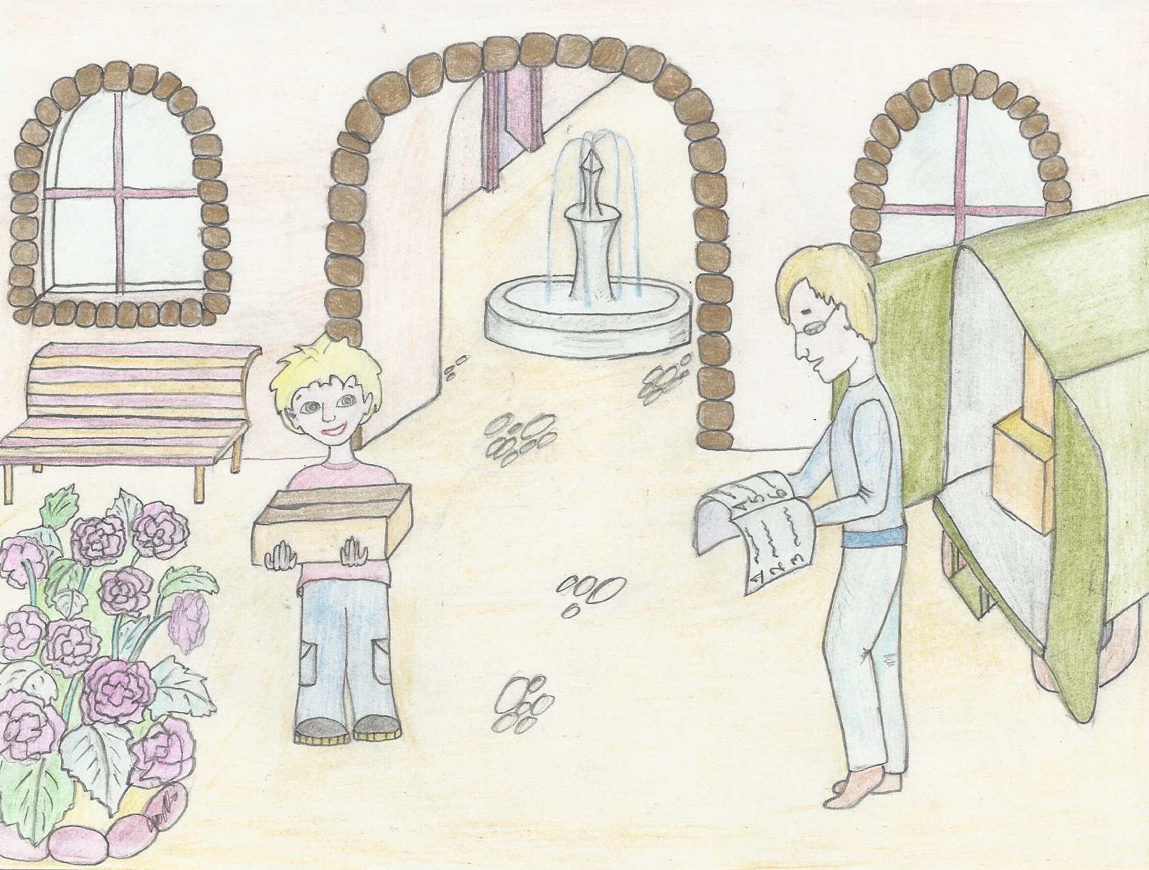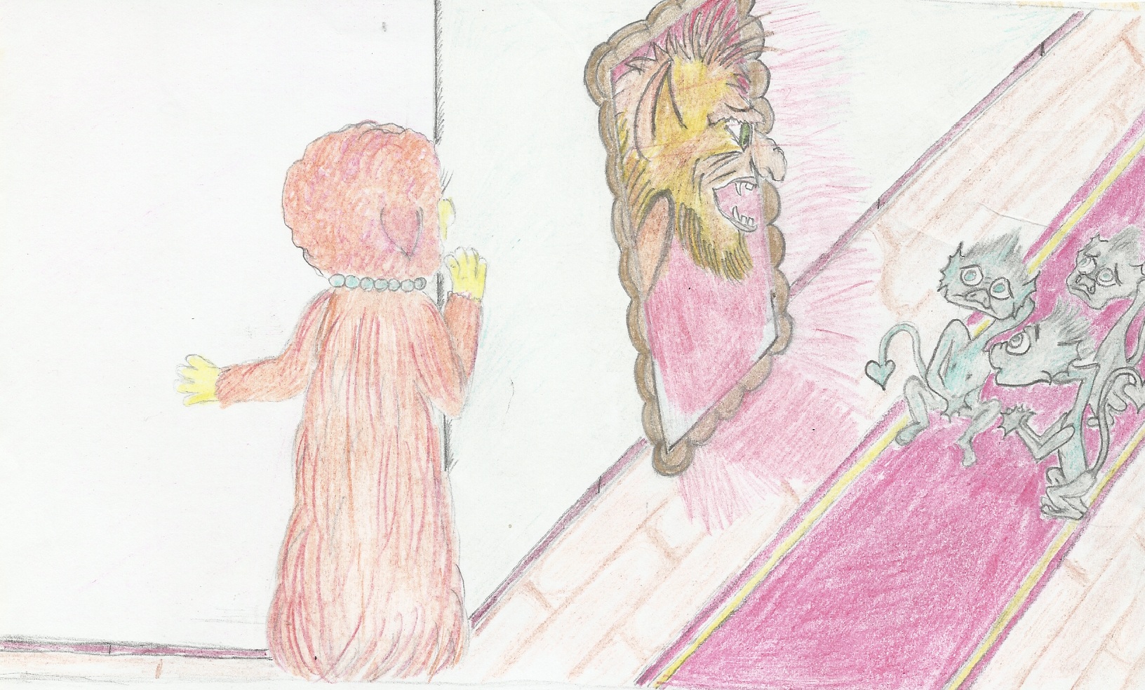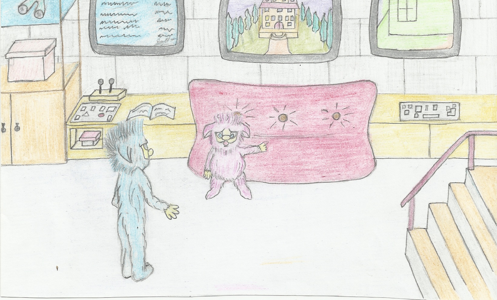 Мышки начали бегать по комнате. Хока побежала под кровать, а Бабай в угол комнаты, где лежали игрушки. Рассмотрев все тщательнейшим образов, они побежали в коридор, который выходил к большой лестнице. Эта лестница разделяла дом на две части. Мышки остановились у большой лестницы и постепенно начали увеличиваться в размерах, пока не превратились в настоящих себя. К счастью, на дворе стояла глубокая ночь, и их никто не мог заметить. Бабай с Хокой на цыпочках направились в сторону левого крыла дома. У них на пути возникла большая комната. Зайдя в нее, Бабай и Хока застыли в изумлении. На стенах висели красивые картины, а по всей комнате стояли статуи и большие вазы, расписанные удивительной красоты узорами. Они остановились, чтобы осмотреться вокруг.