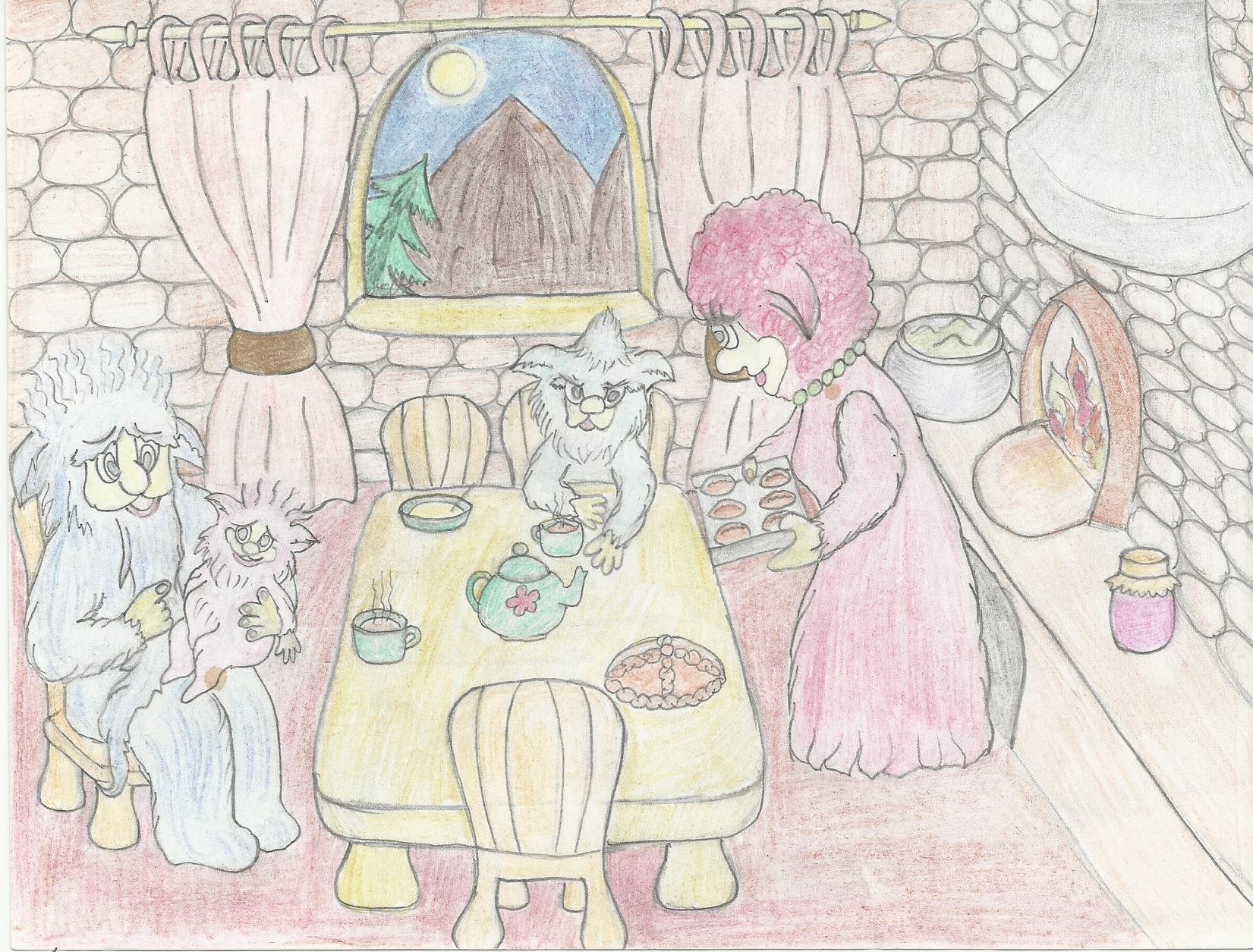 Стен в кабинете практически не было видно. Их закрывали полки с разными книгами, которые так любило читать все семейство. С потолка над столом Бабая висела огромная ракушкообразная трубка, которая служила ему трубкой громкой связи. В эту ночь он как обычно потянул ее к себе, и позвал все семейство в свой кабинет. Обычно Бабай самостоятельно справлялся со своей работой, но иногда, как в эту ночь, ему приходилось обращаться за помощью к родне. Хока, Бука и Кока в такие ночи испытывали огромную радость от подобного приглашения. Для них такие приглашения всегда были праздником. Вот и в этот раз отцу семейства понадобилась их помощь. Хока, услышав голос мужа, включила свою любимую музыку на магнитофоне, и вместе с Букой и Кокой паровозиком направилась к кабинету Бабая.