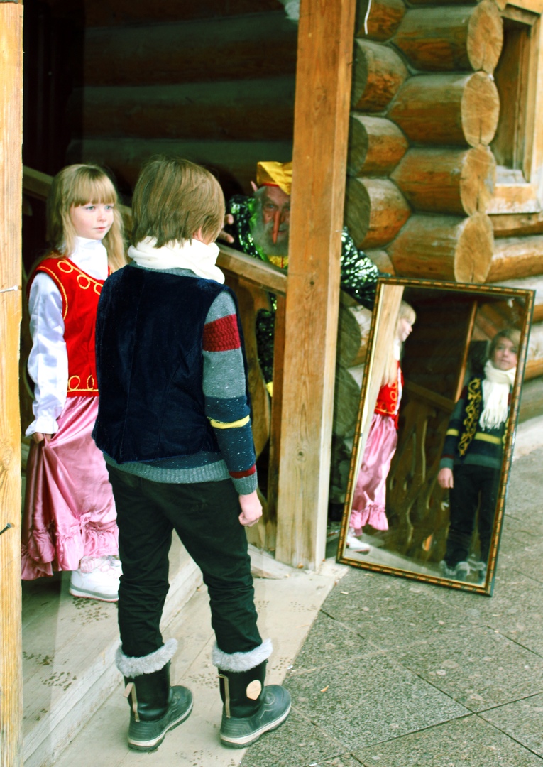Когда на следующий день дети залезли в пещеру, то к своему огромному удивлению обнаружили там корону Снежной королевы. Стопка книг рядом предполагала, что нужно искать выход. Недолго думая, они раскрыли книгу Льюиса Кэрролла и попали в зазеркальный мир.