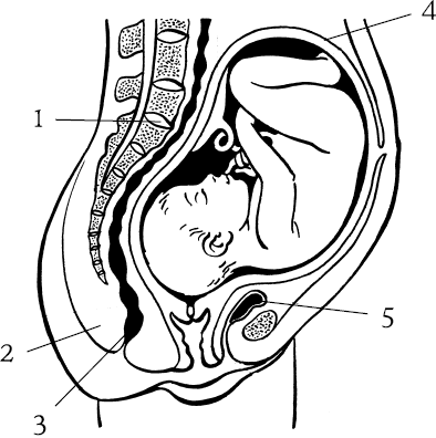 Рис. 18. Расположение внутренних органов женщины и будущего ребенка в утробе матери: 1 – толстая кишка, 2 – анус, 3 – влагалище, 4 – матка, 5 – мочевой пузырь