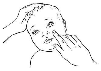 Если врач порекомендует массаж, он должен показать, как его делать. Толчкообразными движениями надавливайте подушечкой пальца в области слезного мешка (небольшого участка между внутренним уголком глаза и боковой поверхностью спинки носа) сверху вниз, строго в вертикальном направлении, 10–15 раз. Эту процедуру надо выполнять три-пять раз в день. Цель массажа – разрыв желатинозной пробки. Если к трем-четырем месяцам разрыва пленки не происходит, требуется операция под местной анестезией – зондирование слезно-носового канала.