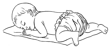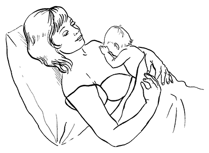 • Положите его голым пузиком на свой обнаженный живот, займите при этом полулежачее положение, прикройте сверху одеяльцем и поглаживайте его спинку. Эта процедура «кожа к коже», «живот к животу» оказывает к тому же благоприятное психотерапевтическое воздействие и на ребенка, и на маму.