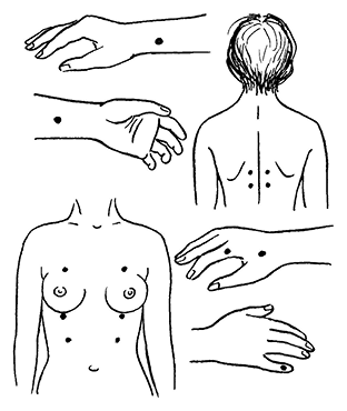 Указанные на схеме точки на передней поверхности грудной клетки и на кисти руки нужно легко массировать по часовой стрелке по 30–60 секунд каждую два раза в день.