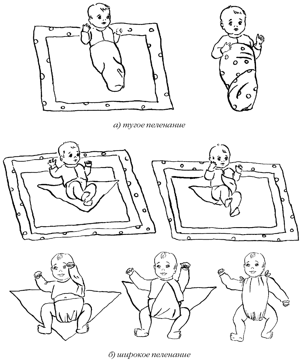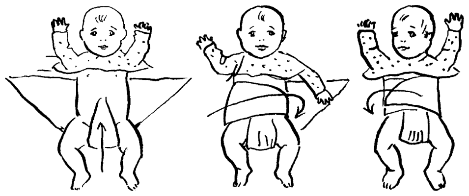 ПеленаниеВсе девочки в детстве пеленали кукол и, может быть, поэтому даже у самых неопытных мам меньше всего возникает вопросов именно с пеленанием ребенка. Между тугим завертыванием и полностью свободным от какой-либо одежды малышом мамы часто выбирают так называемое широкое пеленание. Обычно дома на новорожденного надевают тонкую распашонку и фланелевую кофточку, а снизу до пояса запеленывают в тонкую и фланелевую пеленки, прокладывая между ножками подгузник.