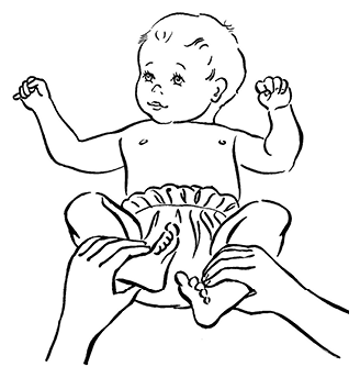Положите малыша на спинку, возьмите его ножки в свои руки и похлопайте его ступнями друг о друга.
