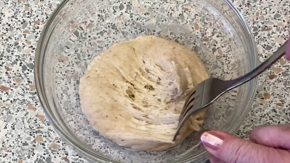 Выкладываем тесто в миску, накрываем миску пищевой плёнкой и оставляем для созревания часов на 10.