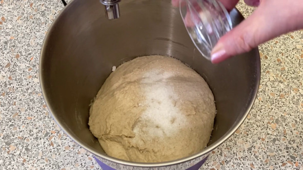 Далее добавляем в тесто соль и продолжаем замес до тех пор, пока соль полностью не соединится с тестом.