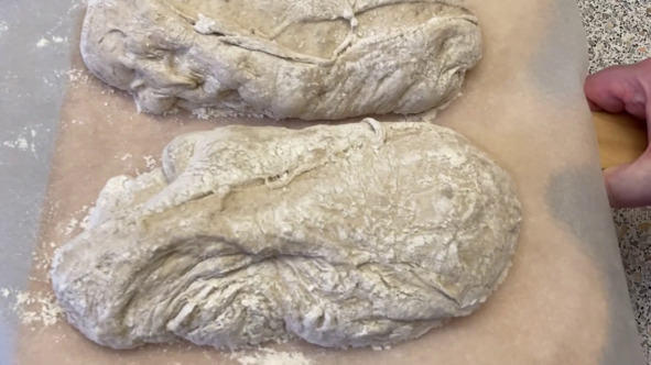 Каждую половину теста переворачиваем разрезом вверх. Кисточкой смахиваем лишнюю муку с пергамента.