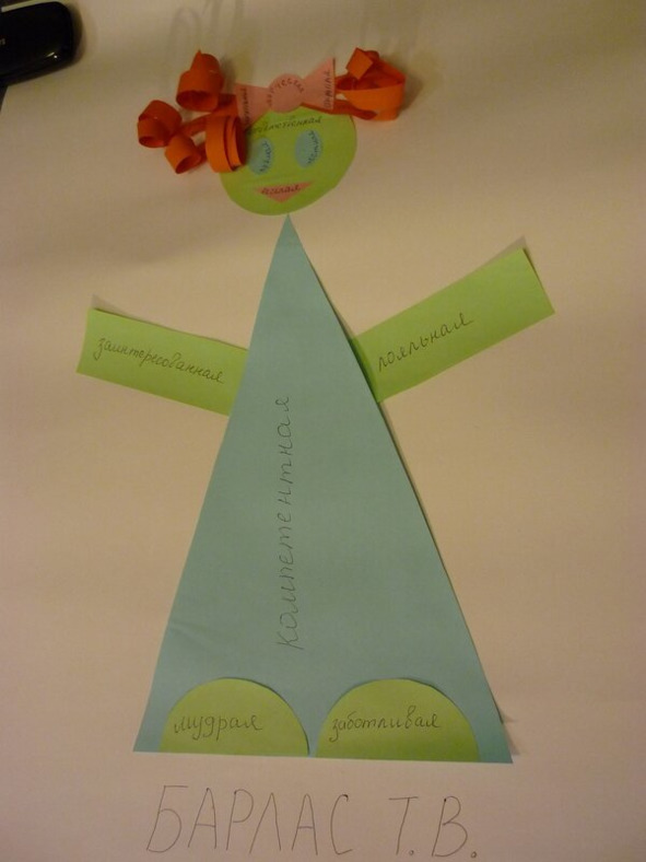 Одна из групп ограничилась образом «героя», которым оказалась… я. Мамадорогая! Чего только они не понаписали… «Компетентная» (туловище), «мудрая», «заботливая» (ноги), «заинтересованная», «лояльная» (руки), «веселая» (рот), «прямая», «честная» (глаза), «ответственная» (лоб), «творческая», «внимательная», «открытая» (бантик), «понимающая», «отзывчивая», «оптимистичная», «тактичная», «психолог-практик», «хороший рассказчик», «юная душой» (кудряшки).