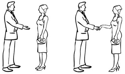 Вариант первый, буднично-рабочий, осуществляется быстро и свободно: с легким полупоклоном руку подают в слегка согнутом положении, не акцентируя локоть и сопровождая жест коротким текстом, например: «Разрешите?..», «Вы не против?..» и пр.