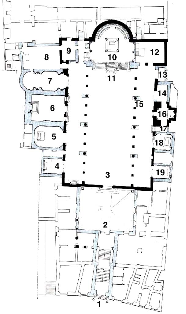 И только потом посетитель попадал в классическую трёхнефную базилику с сияющей драгоценными мозаиками, ярко освещенной абсидой, завершающей центральный неф.