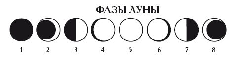 1 – Новолуние, 2 – серповидная Луна, 3 – первая четверть Луны,4 – выпуклая Луна, 5 – Полнолуние, 6 – рассеивающая Луна, 7 – последняя четверть Луны, 8 – бальзамическая Луна.