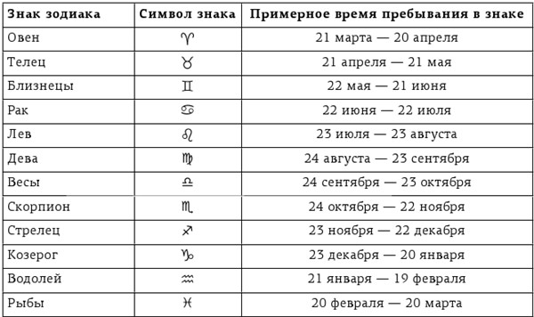 Знак зодиака определяется положением Солнца в том или ином созвездии. Солнце переходит из одного созвездия в другое каждый раз в разное время суток, поэтому родившимся в первый и последний день перехода Солнца из одного созвездия в другое для определения своего астрологического знака необходим личный гороскоп с учетом времени и места рождения. Период пребывания Солнца в знаках зодиака указан в таблице.