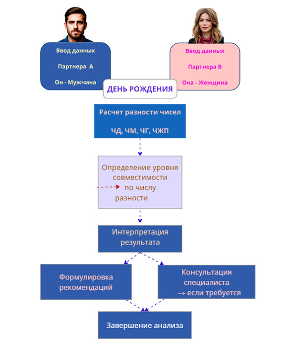Схема анализа совместимости партнеров, показывающая этапы расчета и интерпретации результата. Подробнее мы будем рассматривать её в следующих главах.
