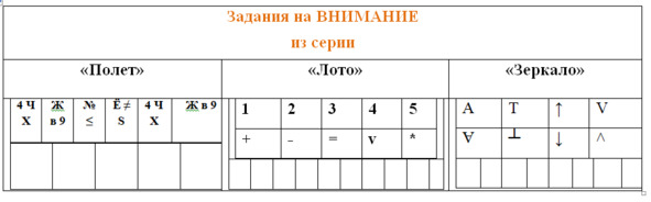 Включают задания на концентрацию внимания, распознавание символов и их последовательное восприятие.