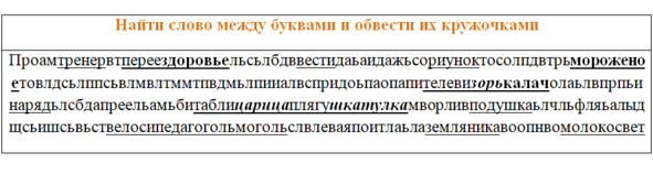 чем быстрее находите слова среди хаоса букв, тем лучше справляетесь с задачей. Задание стимулирует развитие скорости восприятия и обработки информации.
