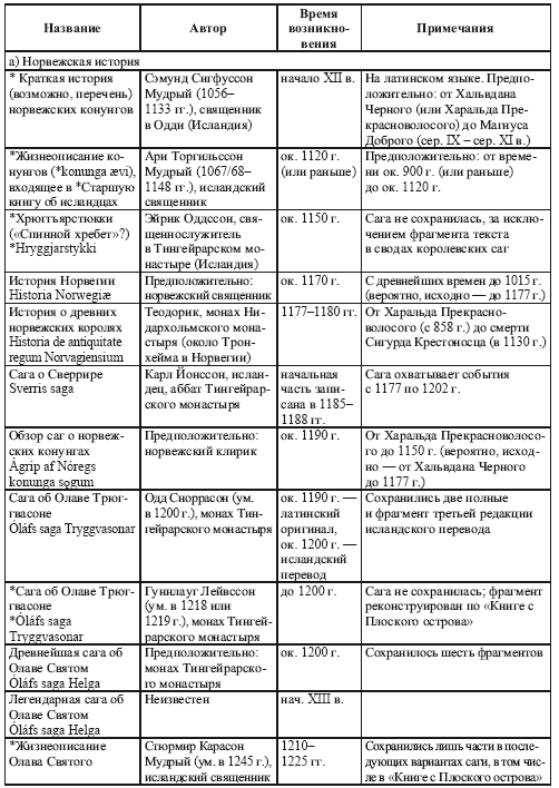 Понимая королевские саги расширительно, исследователи относят к ним не только саги, но и сочинения, выполненные в средневековой латинской исторической традиции. Для обозначения всей совокупности текстов, среди которых центральное место занимают саги о норвежских конунгах, используется термин «исландско-норвежская[20] (или западноскандинавская) историография XII–XIII вв.» (см. табл. 1).