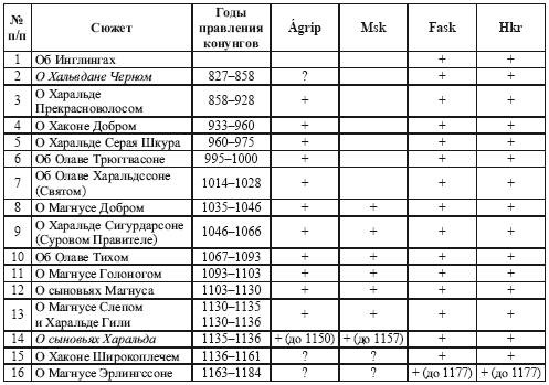 Сводов саг известно всего четыре. Это «Обзор саг о норвежских конунгах», «Гнилая кожа», «Красивая кожа» и «Круг земной». Они посвящены истории Норвегии с древнейших времен до 1177 г. (того года, с которого начинается изложение в написанной раньше сводов «Саге о Сверрире»), и в них четко выделяется (особенно в «Круге земном») 16 саг, точнее – 16 сюжетов, так как в указанных сводах эти сюжеты разрабатываются по-разному (см. табл. 2).