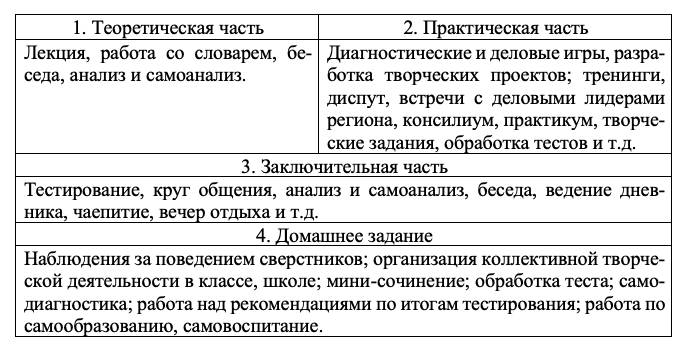 Реализация образовательной программы по лидерской подготовке старшеклассников может осуществляться в виде элективных курсов, факультативных занятий, тематических классных часов.