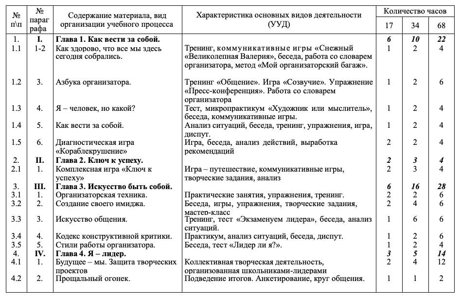 Содержание программы курса раскрывает старшеклассникам искусство быть лидером, секреты организаторской деятельности, техники организатора; помогает осознать ответственность лидера перед коллективом; понять себя и степень готовности к организаторской деятельности.