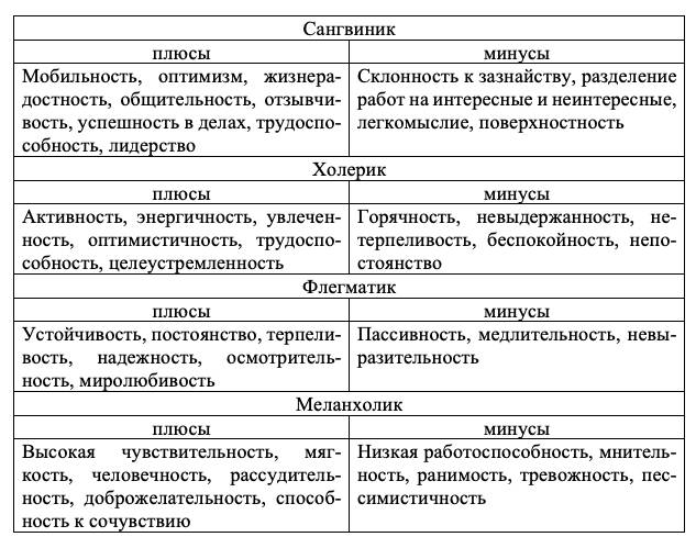 Каждый тип темперамента имеет свои положительные и отрицательные стороны. Попробуем вместе определить «плюсы» и «минусы» каждого типа.
