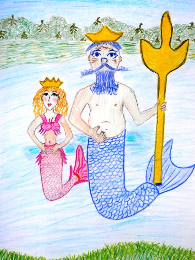 Полина увидела в воде что-то блестящее и, отложив мячик в сторону, нагнулась. Из песка торчал маленький остренький золоченый кусочек. Девочка потянула его и вытащила корону небольшого размера. Полине она так понравилась, что та, недолго думая, примерила ее и посмотрела на свое отражение в воде. Она не узнала себя, на нее смотрела красивая девочка с волнистыми, распущенными волосами, голову которой украшала корона. Из воды появились русалки и поманили Полину к себе, она сделала шаг в воду и ее ноги превратились в рыбий хвост.
