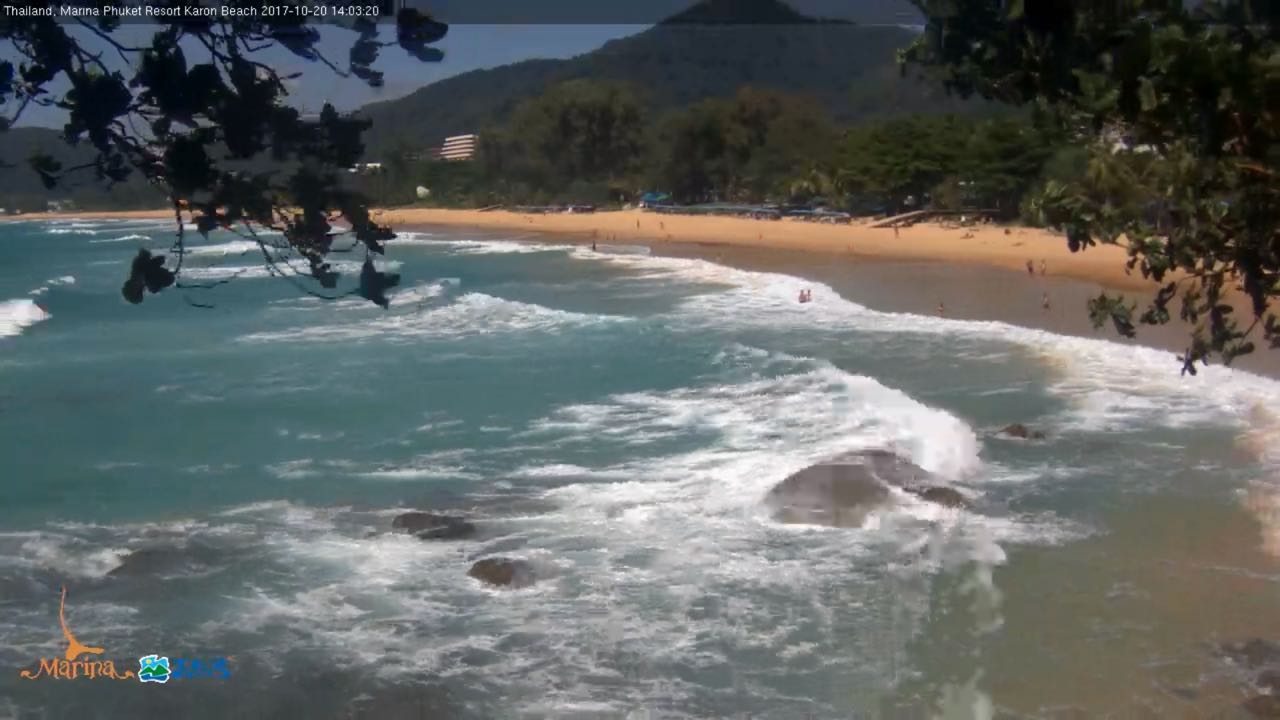 Берег – белый как мел песок, сверху со скалы свисает огромный камень.