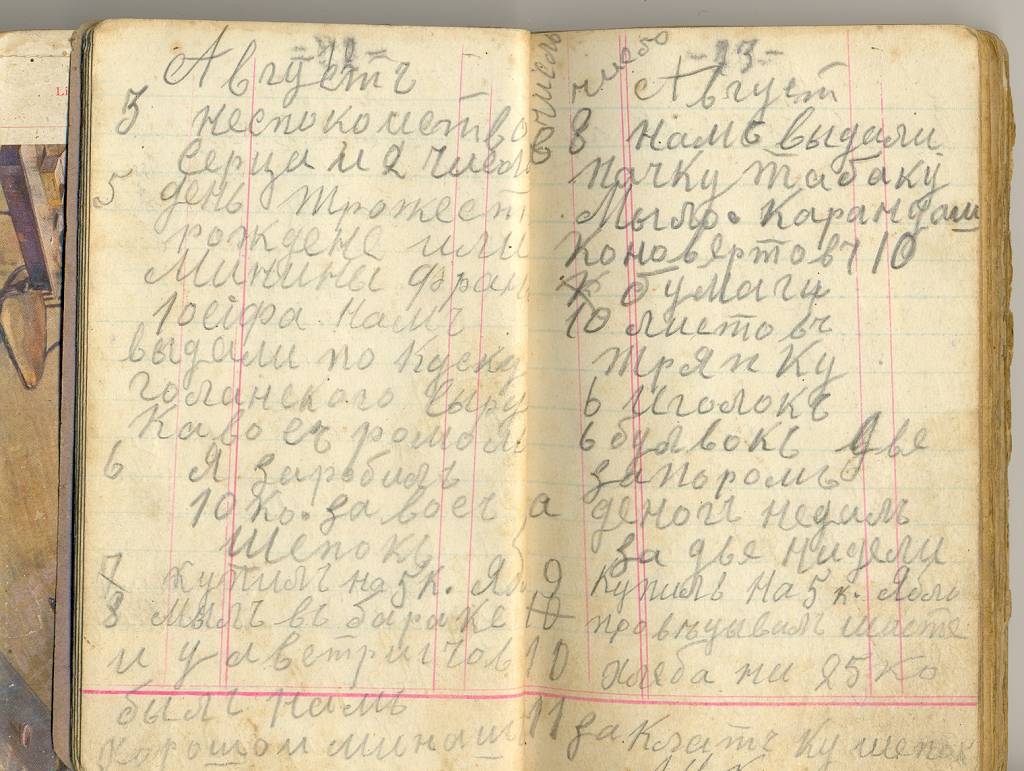 «8-го нам выдали пачку табаку, мыло, карандаш, конверты, бумагу десять листов, тряпку, шесть иголок, шесть булавок».