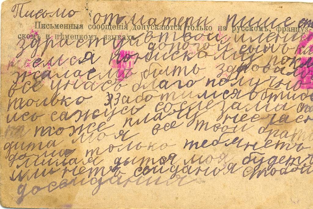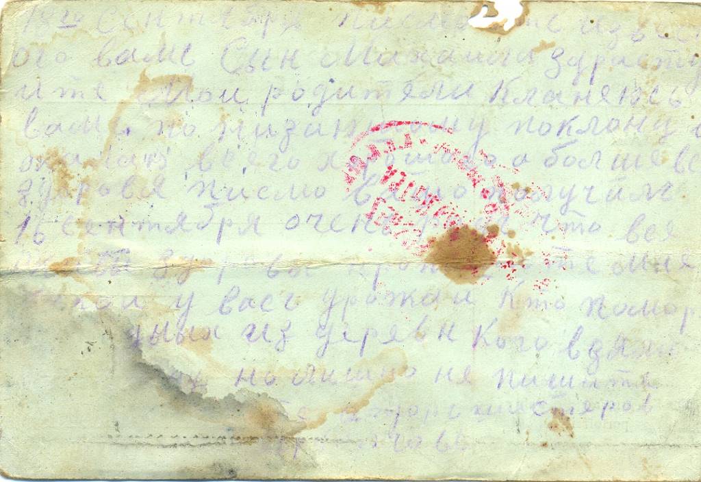 «Письмо от матери. Здравствуй пленник, дорогой сын, кланяемся по низкому поклону, желаем быть здоровым. Все у нас благополучно, только заботимся о тебе, и сажусь со слезами охать. Несчастное дитя мое. Все твои братья дома, только тебя нет. Милое дитя мое, будет или нет свидание с тобой. До свидания».