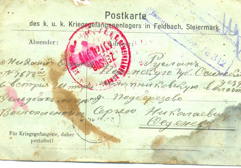 Приятной неожиданностью оказалось то, что согласно Женевской конференции он может написать домой! Михаил, волнуясь, написал на открытке адрес: Русланд, Пермскую губернию, Осинскй уезд, Шляпниковскую волость.д. Подберезово. Сергею Николаевичу Феденеву. Затем, короткое сообщение: «Пишет вам сын Михаил. Здравствуйте мои родители. Кланяюсь вам по низкому поклону мои родные. Очень скучаю и хочу домой. Жизнь моя в плену наладилась. Я здоров».