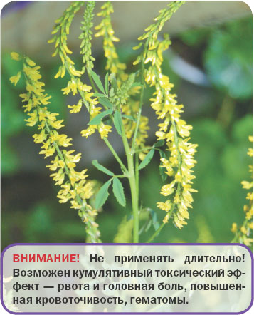 Заваривают сухие резаные побеги донника или только высушенные цветы (сырье приятно пахнет) из расчета 1:30 (1 ч. л. на 1 стакан кипятка), настаивают под укрытием 30 минут и пьют по 2 ст. л. 4–5 раз в день как хорошее отхаркивающее средство при бронхитах, пневмониях, простудах. Донник применяют как спазмолитическое средство при кишечных коликах, головных болях, предменструальном синдроме. Применяют ингаляции из травы для лечения верхних дыхательных путей. Распаренную траву или масло с донником прикладывают к больным суставам, несозревшим нарывам и карбункулам, гематомам, трещинам, ранам. Для лечения хронической гипертонии, бронхитов, колитов и неврастении рекомендуют принимать по 2–3 ст. л. холодного настоя донника: 2 ч. л. заливают 2 стаканами воды и настаивают 2–3 часа (суточная доза). Пьют не долее 2 недель (кумарин, содержащийся в траве, накапливается и действует негативно). Сходным действием обладает донник белый (Mililotus alba) с белыми цветками, растущий на лугах и пустошах.