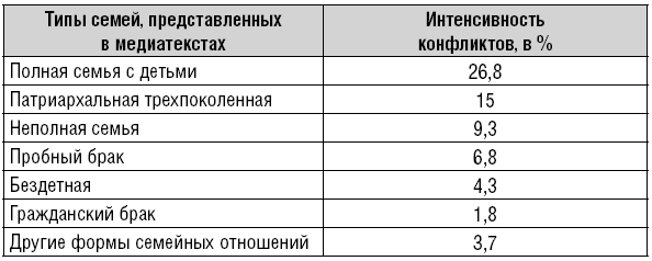 Типы семей, представленные в медиатекстах. В российском обществе получили распространение различные типы семейных отношений, и ни один из них не свободен от проблем и конфликтов. Однако в исследуемых текстах интенсивность конфликтов и их характер распределились между семьями неодинаково: