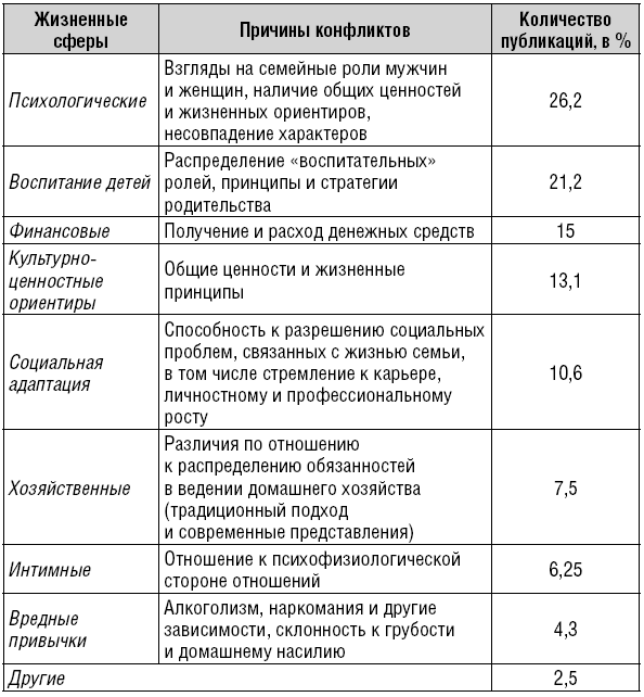 Жизненные сферы и причины конфликтов. Строго говоря, причины и сферы конфликтов не одно и то же, однако в данном случае, учитывая «тесность» семейного пространства, они максимально сближаются. Анализируя публикации о семейных коллизиях, мы выделили причины конфликтов, представив их рейтинг в виде следующего ряда: