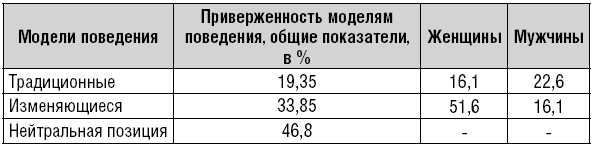Гендерные роли. Как и предполагалось, в семейных конфликтах наблюдается динамика гендерных ролей. Исследование опиралось на представление о традиционных гендерных характеристиках (муж, мужчина – глава семьи, занимает приоритетное положение во всех сферах жизни, является добытчиком, решает проблемы семьи, воспитанием детей занимается мало; может использовать силу для утверждения своего приоритета, активен, силен, умен; ему позволено принимать самостоятельные решения; жена, женщина – признает приоритетное положение мужа, работает, занимается воспитанием детей. Может быть образованнее и умнее мужа, однако право принимать основное решение ей не принадлежит) и характеристиках изменяющихся (они могут быть как современными, прогрессивными, основанными на равенстве прав и обязанностей, гендерном согласии, так и регрессивными, связанными с отказом от семейных обязанностей, безответственностью, а также с их узурпацией, произволом и насилием – как со стороны мужчин, так и со стороны женщин). Нам удалось выявить, что количественно приверженность традиционным и изменяющимся моделям поведения распределилась таким образом:
