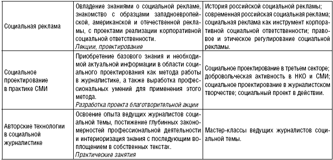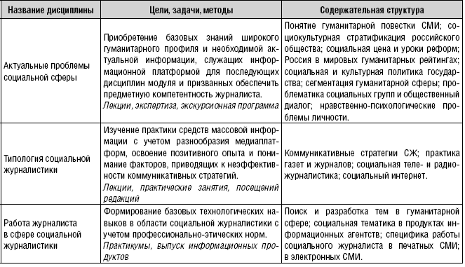 Решение обозначенных проблем удалось существенно продвинуть с принятием нового Государственного образовательного стандарта, совпавшего с реформой высшего образования в стране. С появлением в программе бакалавриата профессиональных модулей для реализации задач предметно-тематической специализации появились новые и немалые возможности. Теперь программа специализации «Социальная журналистика» рассчитана на 4 семестра, в ней 6 учебных курсов, к ведению занятий привлечены преподаватели трех профессиональных кафедр: периодической печати (базовая кафедра), телевидения и радиовещания, рекламы и связей с общественностью. По-прежнему значительно участие партнеров: Агентства социальной информации, некоммерческих и правозащитных организаций, журналистов редакций газет и журналов. Методы студийной работы, использовавшиеся ранее, удачно вписались в новые планы; они прямо ориентированы на реализацию компетентностного подхода. Концепция преподавания, как и ранее, базируется на гуманистических принципах и представлении о миссии СМИ как общественной службе, но содержательно программа значительно расширена и углублена. Предлагаемая далее таблица содержит ее основные положения.