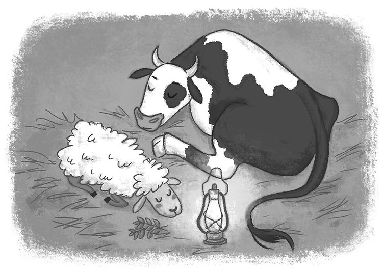 Свет от керосиновой лампы мягко освещал стойло. Овечке сделалось легко и спокойно. Она прижалась к мягкому боку коровы и не заметила, как уснула крепким сном.