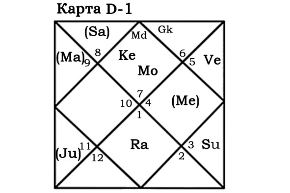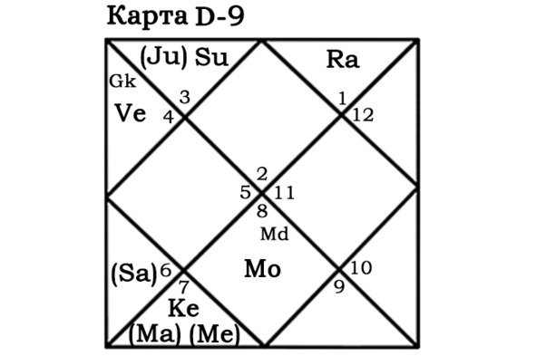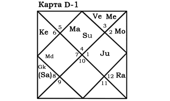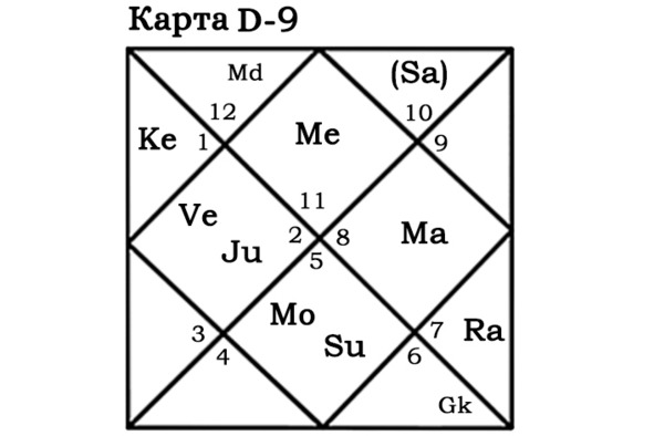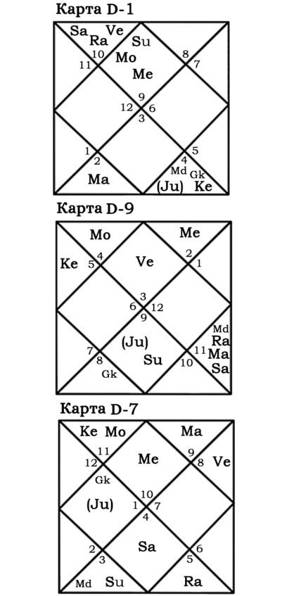 Можно добавить, что хозяин Даши Юпитер также аспектирует PK – Венеру в 11-м доме, тогда как Солнце (хозяин Антардаши) стоит в 9-м доме Саптамши.