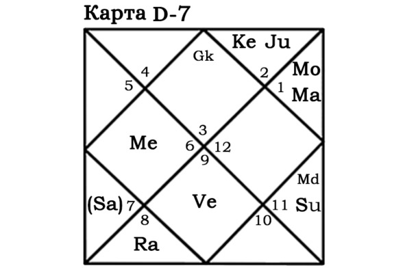 Юпитер управляет 9-м домом и является естественным сигнификатором детей, тогда как Сатурн стоит в 5-м доме Раси и Саптамше, аспектируя 9-й дом в Навамше.