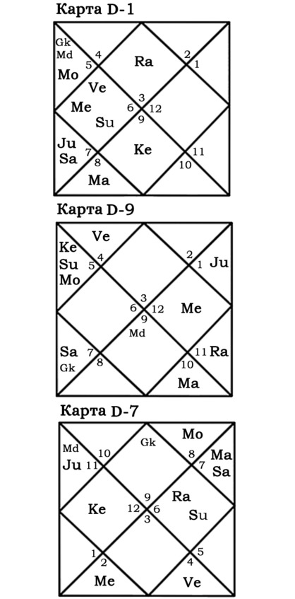 Таким образом, можно сделать вывод, что и хозяин Маха Даши, и Антардаши, и Пратьяантардаши должны быть связаны с домами детей (5-м и 9-м домами карт Д1, Д9 и Д7) тем или иным образом, многократно повторяя обещание зачатия и успешного материнства.