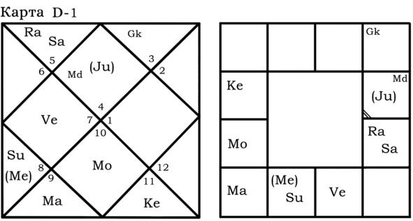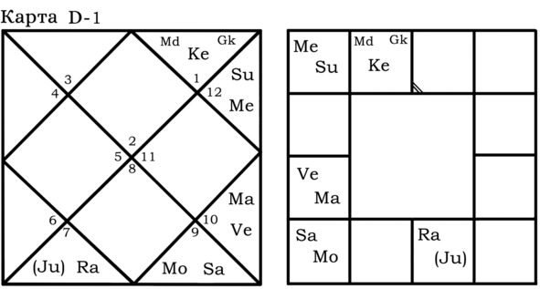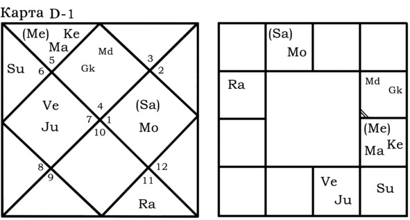 Меркурий в данном гороскопе имеет соприкосновение с 1-м домом, так как аспектирует Луну. Он говорит о том, что лечение текущих заболеваний не приносит облегчения. В Антардашу Меркурия у женщины началось обострение расстройств пищевого поведения на фоне случившегося развода.