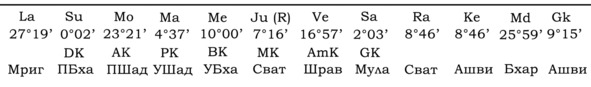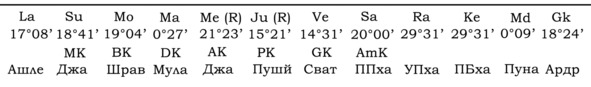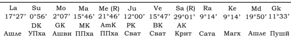 Часто такое положение Асцендента и Лагнеши говорит о том, что вся жизнь человека омрачена неким духовным или физическим заболеванием. Давайте рассмотрим пример такого гороскопа.