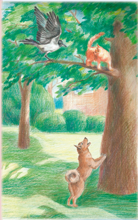 По тропинке до воротШёл спокойно рыжий кот.Мой щенок с весёлым лаемПобежал за ним к сараю,Но с тропинки кот исчезИ на дуб высокий влез.Глупый, глупый рыжий котСделал всё наоборот!Он не знал, что в пышной кронеМесто нравилось вороне,Много веток для гнездаПринесла она туда.Вниз она слетела метко,Села с ним на ту же веткуИ старалась как-нибудьПобольнее ущипнуть.Кот к стволу, как мог, прижался,От вороны отбивался,Он шипит – она клюет,А внизу собака ждёт.