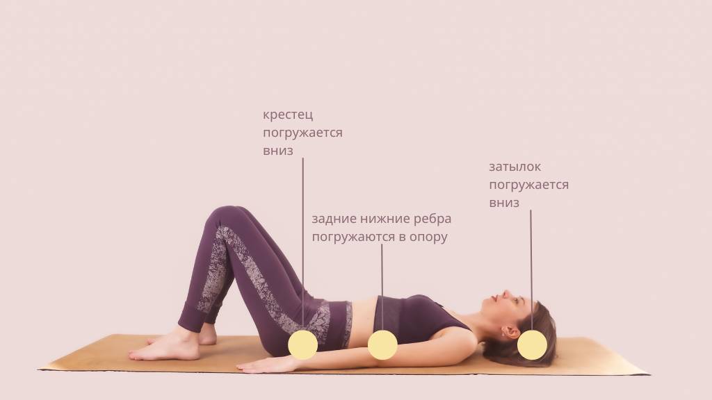 Для новичков мы используем положение лежа, чтобы опора помогла нащупать эту самую нейтраль. Мы ложимся с согнутыми ногами на коврик и, расслабляясь, словно погружаем в пол крестец, задние нижние ребра и затылок.