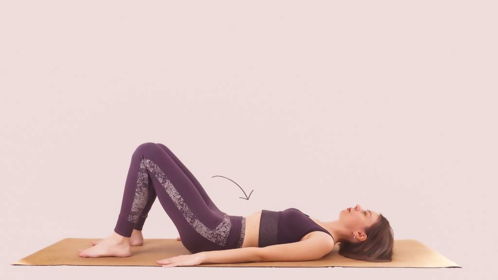 На вдохе стопами мягко подтяните коврик на себя. Движение передается в область таза, и таз немного наклоняется, копчик чуть сильнее разворачивается в сторону пола. На выдохе наоборот стопами выталкивайте коврик от себя и передавайте движение в таз, позволяйте ему наклоняться в другую сторону, копчик слегка разворачивается в сторону потолка.