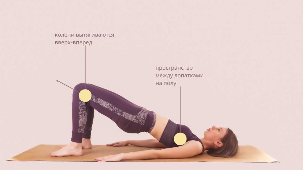 Для этого упражнения нужно убрать одеяло из-под головы, если вы его использовали. Начнем с выдоха, и, как в предыдущем упражнении, ваши стопы отталкивают пол от себя, таз наклоняется. А затем постепенно отрывайте таз от пола и позвонок за позвонком приподнимайте спину. Коленями тянитесь вперед-вверх. Удерживайте на полу верхнюю часть спины – пространство между лопатками.