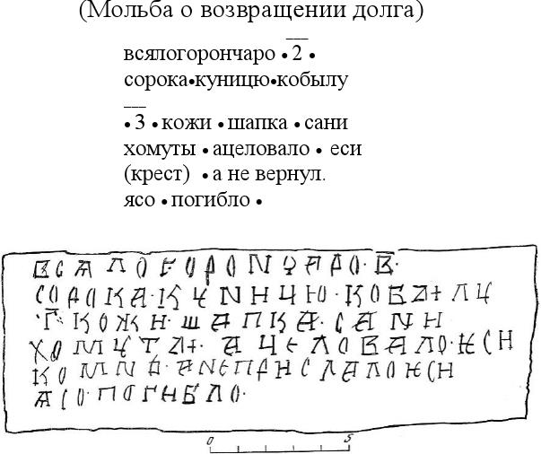 (1) Перевод: "Взял гончар (Гончар?) 2 | сороки •куниц | кобылу | 3 •кожи | шапку | сани, хомуты | А целовал | мне (крест) | а не вернул | Я погиб | (разорен?)".