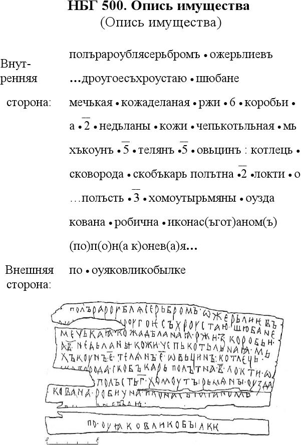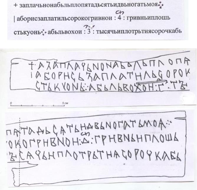 (2) Одна из самых больших сумм грамот. Мнение издателей: за 3100 беличьих шкурок было уплачено 89 гривен, 2 ногаты и 5 с половиной кун, итого 2233 куны; платили двое – старший (имя не указано) и младший братья Борис (братья – по умолчанию); Яким писал под диктовку собственника / Яким был управляющим в хозяйстве старшего брата. Грамота определена в общем виде как документ хозяйственного учета (с. 119).