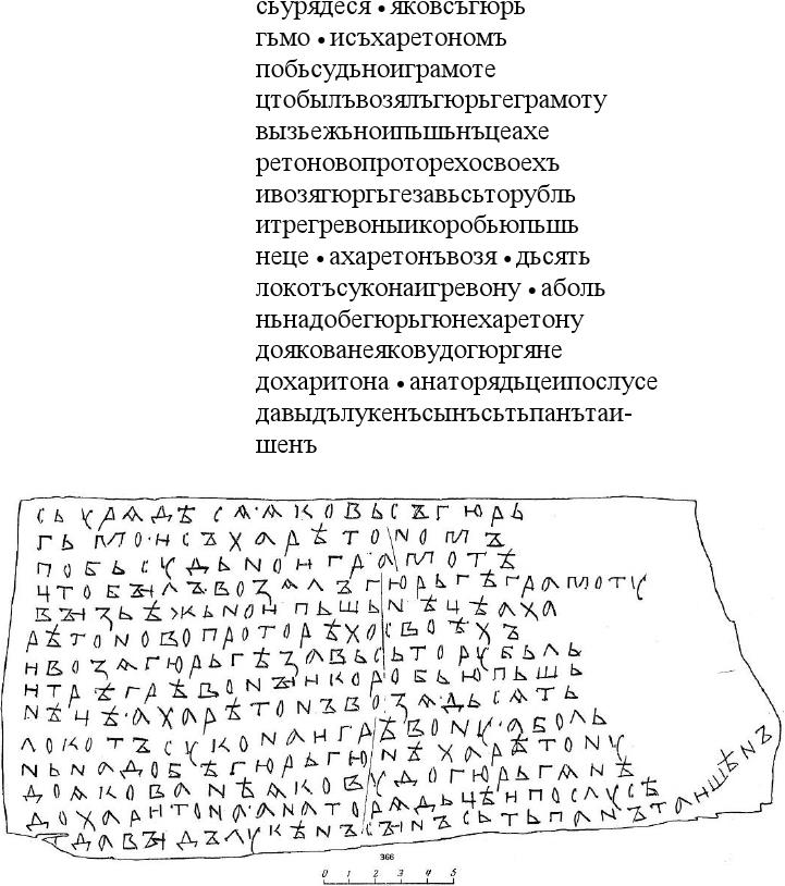 (1) Перевод: "Вот расчелся Яков с Гюргием | и с Харитоном по бессудной грамоте, которую Гюргий взял по делу об изъезженной пшенице, а Харитон о своих убытках. И взял Гюргий за все то рубль и три гривны и коробью пшеницы | а Харитон взял десять локтей сукна и гривну | А более не надо ничего ни Гюргию, ни Харитону от Якова, ни Якову от Гюргия и Харитона | А на то рядцы и послухи Давыд, Лукин сын, и Степан Тайшин".