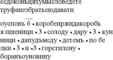 (1) Перевод: "Вот договорились Мысловы дети, Труфану с братьямидавать оброка 6 коробей ржи да коробью пшеницыи | 3 | солоду | дара | 3 | куницы | да пуд меду | детям по белке | 3 | и | 3 | горсти льна | барана во время сбора урожая".